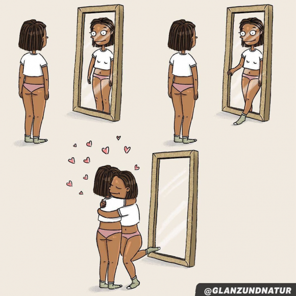 - Mache eine liebevolle "Bestandsaufnahme". Gehe dazu einmal deinen ganzen Körper von Kopf bis Fuß ab. Beschreibe was du siehst. Was gefällt dir an deinem Körper?
