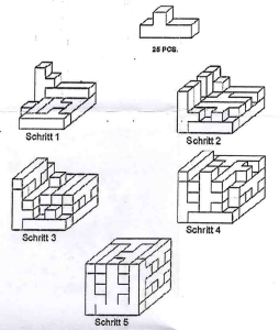 Leg die Anleitung verdeckt zur Seite. Setzt die erste Etappe des Geschicklichkeitsspiels aus deinem Gedächtnis zusammen. Falls es auf Anhieb nicht klappt, beginne noch einmal von vorn.